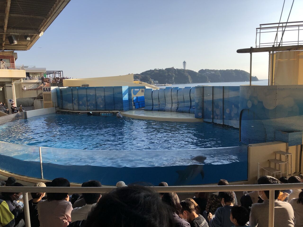 ダイナミックな6匹のイルカたちが繰り広げるショー。いままで、自粛を余儀なくされていたイルカと調教師たちの織りなすコラボ。妻が涙ぐんでいた…。なにを感動してんだが知らんが。